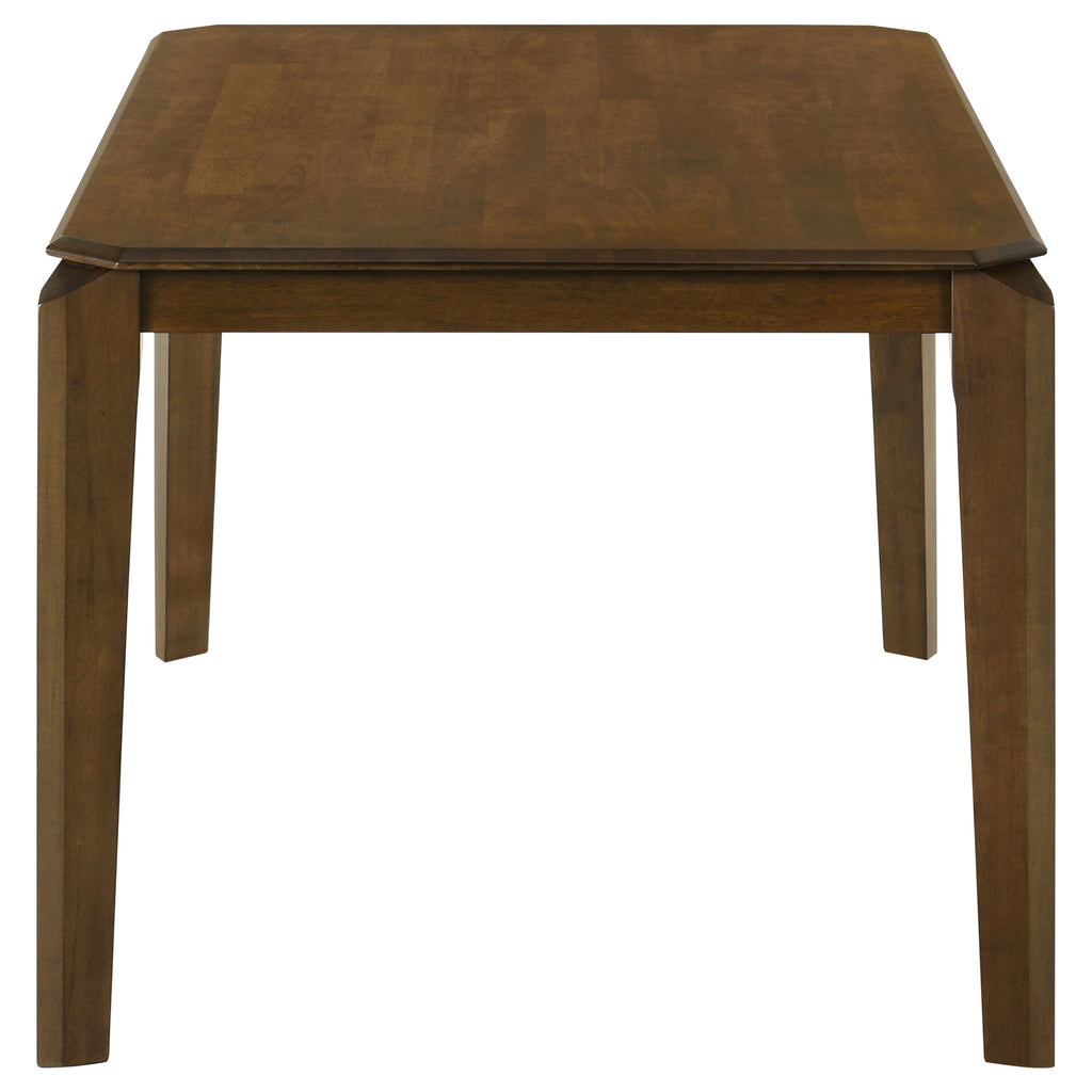 Create a refined but approachable ambiance in your dining room or kitchen with a modern rectangular dining set. Designed for a stylish but grounded look and feel, it centers on a stylish table with angular details. Its chamfered edge pairs with an almost faceted look to create engaging angularity. A dark brown wood finish complements hardwood construction, while chairs are adorned with foam seat cushions and beige upholstery for stylish contrast. The design is complete with cut corners on the tabletop and open chair backs that add visual detail and depth without overwhelming your space. Key Features: • Artisan details enhance the eye-catching look of a modern five-piece rectangular dining room set • Dark brown finishing highlights wood grain details and offers rich, refined character • Table features a chamfered edge with gently tapered, angular legs that catch the eye • Chairs feature beige upholstery over foam cushions with open backs that create a light, airy look • Made from rubberwood for excellent quality, durability, and a refined look and feel