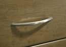 Transform your bedroom into a stylish and serene retreat with this modern bedroom set. The warm nutmeg wood finish across all pieces creates a cohesive and inviting atmosphere, while the soft, beige upholstered headboard on the bed adds a touch of luxury. The case pieces feature smooth metal extension glides for effortless functionality, and the rounded corners on all pieces contribute to a sleek, contemporary look. Matte nickel hardware provides a refined accent that complements the overall aesthetic. Crafted from solid Asian hardwood and engineered wood, this set combines timeless design with everyday practicality.