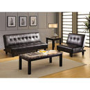 This sleek modern design is also comfortable and functional. The sofa converts into a bed quickly and easily and the chair converts into a comfortable chaise lounge. The extra built-in leg adds extra support. Upholstered in espresso leatherette.