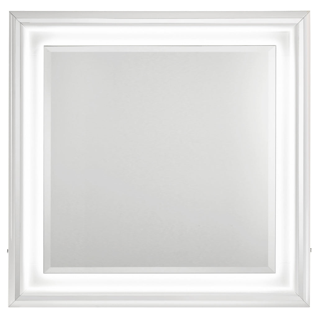 Crisp white high gloss and sculptural textures define this modern bedroom set, blending sleek surfaces with dimensional details. Geometric drawer fronts feature ribbed V-patterns and polished chrome pulls, while all drawers glide smoothly on 45mm metal extension hardware. The headboard stands out with chevron-tufted white faux leather framed by soft white LED trim. Completing the ensemble, a coordinating LED dresser mirror adds ambient glow and polished symmetry to the space. Elevated on chrome legs, this set is a showcase of contemporary form and function. Key Features: • White high gloss bedroom set with sculpted drawer fronts and chevron-tufted LED headboard • LED dresser mirror adds ambient lighting and visual symmetry to the modern design • All drawers include 45mm metal extension glides for smooth and reliable performance • Top drawers are fully lined in black felt to protect valuables and add elevated utility • Chrome U-shaped pulls and tapered acrylic legs provide sleek contrast and support • Crafted from engineered wood and faux leather for durability and shine