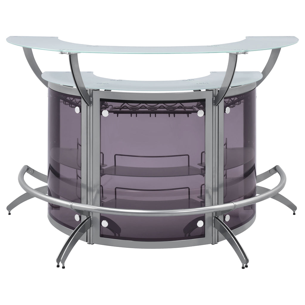 Presenting plenty of contemporary vibes, this home bar is sleek in every aspect. The black finish and acrylic construction give this piece an upscale look and feel. A rounded design offers storage space on multiple shelving units. Also included on this contemporary bar table are stemware racks to hold plenty of wine glasses. Whether you are entertaining a party of two or many, this contemporary bar table is the right choice for a stylish home. Key Features: • Contemporary bar unit showcases a curved chic design with metal frame in a silver finish • Smoked acrylic panels provide a high-end feel • Two-tier frosted tempered glass tops with two (2) frosted tempered glass shelves • Features stemware rack and three (3) bottle wine rack • Features 3 units, creating the ultimate bar setup