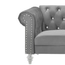 Introducing the Emma living room set - the perfect combination of style and comfort for your home. This set includes a sofa, loveseat, and chair, all featuring a stunning crystal tufted back that adds a touch of glamour to any space. Made with 100% polyester, these pieces are durable and easy to maintain. The set is available in three sleek colors - blue, black, and gray - so you can choose the one that best matches your decor. Upgrade your living room with the luxurious Emma set and enjoy hours of relaxation and entertainment.