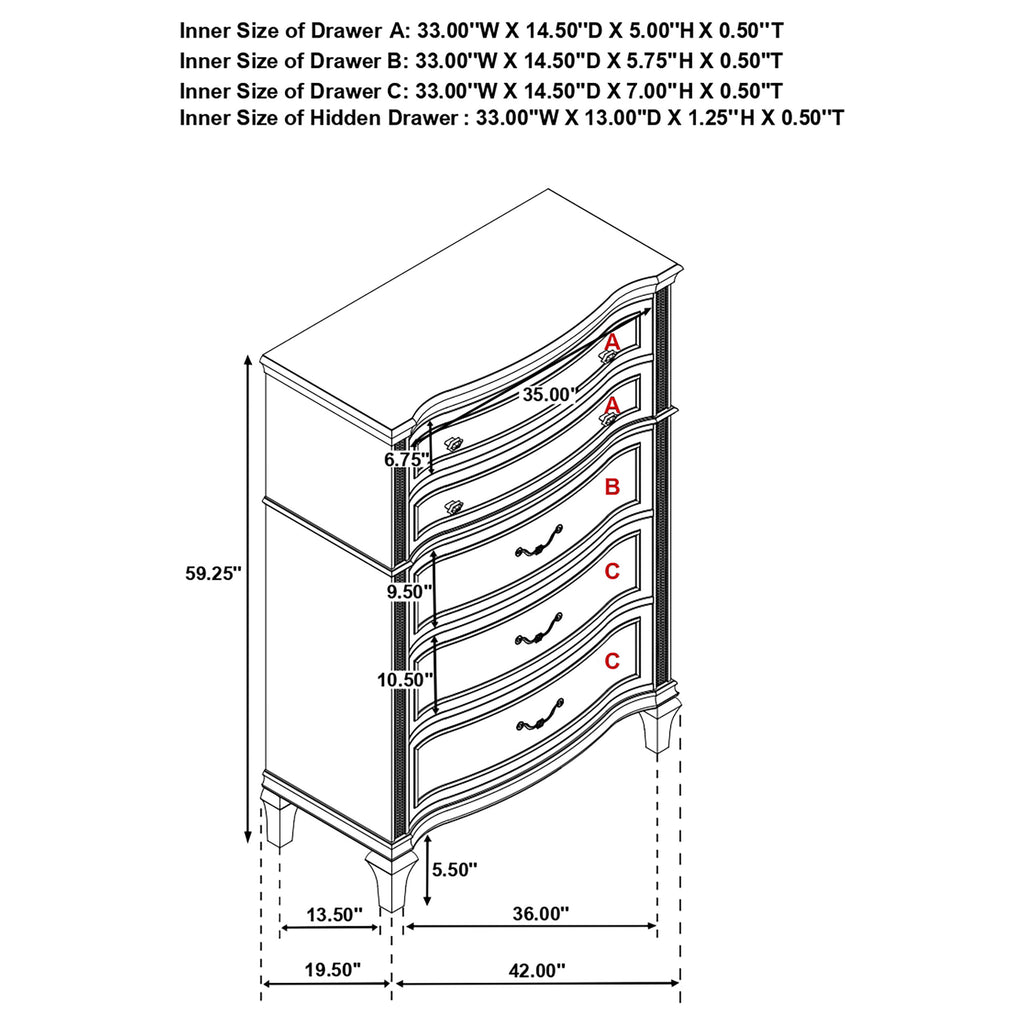 Complete your primary suite with this stunning, glam bedroom set, featuring a lovely platform bed, nightstand, dresser, and mirror combo in a gorgeous silver oak finish with glittering accent panels. The platform bed boasts a beautiful double arch headboard and matching footboard, designed with a channel tufted, foam padded insert upholstered in a soft, ivory fabric that invites you to lean back and relax. Soft, grey, felt-lined top drawers in the dresser and nightstand keep delicates protected, while the nightstand offers a built-in USB port to keep handheld devices charged as you prepare for the day. Slender hexagon-shaped hardware with pearlescent accents adorns each of the curved drawer fronts, allowing you to grab items easily. A double arch framed mirror with a timeless beveled edge offers a contemporary flair and sleek attention to detail. Key Features: • Double arch head and footboards feature lush ivory fabric upholstery with foam padding • Silver oak finish with glimmering accent panels is elegant and modern, delivering a glam finishing touch • Framed beveled mirror creates an instant dressing vanity setup • Hexagonal shaped hardware with pearl-like center accents offer a modern flair • Soft grey felt lining on the top dresser drawers offer space for delicates