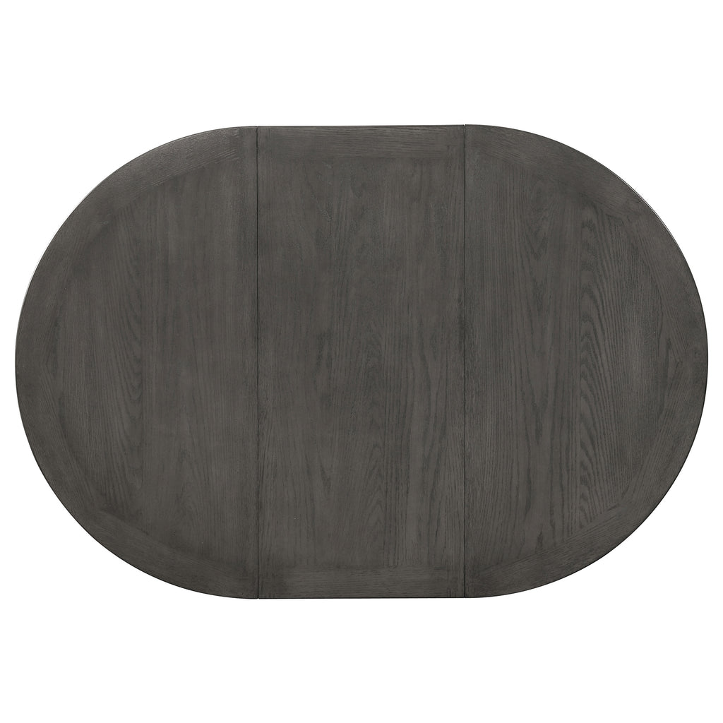 The ultimate in versatility and engaging style, this wood dining table is a perfect centerpiece in a dining room or breakfast nook. The ingenious base features both closed storage and an open shelf, creating opportunities for storage and display. A medium grey finish is a contemporary addition to rubberwood and MDF construction. The table is complete with an 18-inch extension leaf perfect for welcoming friends to gather for a meal. Clean lines are accented with arched trim that adds a pleasing hint of detail. Key Features: • Oval dining table with transitional styling and integrated extension functionality • Medium grey finish highlights wood grain over a rounded tabletop surface • Eighteen-inch leaf extends the table for larger gatherings or added flexibility • Pedestal base includes a lower shelf and concealed drawer for storage use • Framed detailing on the base adds subtle texture to the classic design • Constructed from solid hardwood, engineered wood, and oak veneer