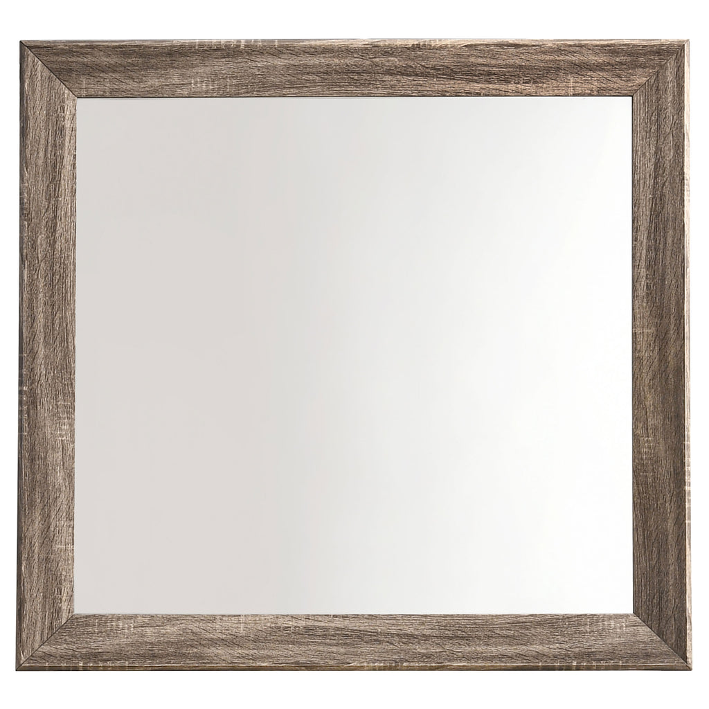 Crafted for durability, this four-piece bedroom set is a practical choice. It features a lovely, transitional design that blends seamlessly with a variety of home decor styles. Bold, black recessed grooves stand out strikingly against its subtle, washed taupe finish. Natural oak wood grain raised on engineered wood adds an effortless touch of glamour. Rounded out with picture framed case fronts and ample drawer space, this set exudes quality, class, and convenience. Key Features: • Bedroom set with panel bed and bold rectangular framing throughout • Washed taupe finish features a warm wood grain look with black recessed grooves • All case pieces include picture frame drawer fronts for added visual depth • Antique brass handles add contrast and easy access to storage compartments • Smooth-operating drawers use Kenlin glides for durability and functionality • Built from engineered wood, scratch-resistant laminate, and sturdy composite materials