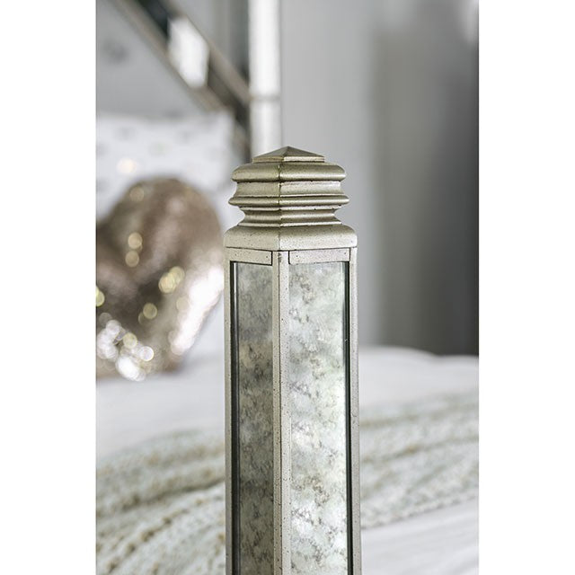 Transform your bedroom in to a master suite with this decadently luxurious bed. Antique mirror panel inserts line every trim of the bed, up the four posts and along the geometric head and footboards. They introduce a golden colored light into your bedroom that's only fitting this magnificent collection of comfort and regal design.