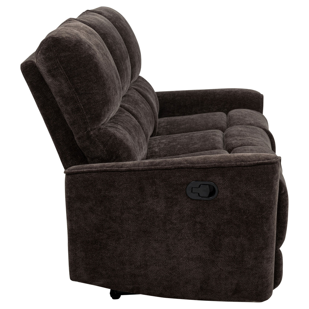 Softly tailored and built for comfort, this reclining sofa invites everyday relaxation with ease. Deep cushions and plush chenille upholstery wrap you in warmth, while channel tufting along the back enhances support and flow. Smooth manual recliners extend at your fingertips, offering personalized comfort from seat to seat. Framed in durable wood and metal, it brings a perfect balance of softness, structure, and restorative ease to any living room. Key Features: • Reclining sofa with manual levers and deep cushions for laid-back living room comfort • Dark brown chenille upholstery adds soft texture and cozy warmth to the frame • Channel-tufted backrests offer targeted support and gentle contouring • Padded armrests provide comfort from every angle while lounging or reclining • Crafted from fabric, metal, plywood, and foam for durable everyday relaxation • Perfect for casual living rooms seeking cozy function with easygoing style