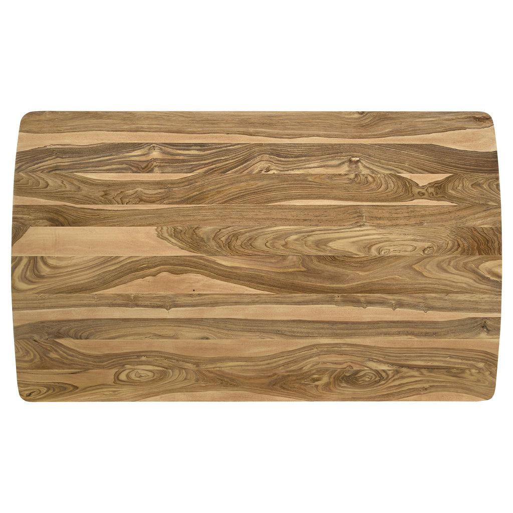 A perfect addition to contemporary homes, this mid-century style counter height table creates a warmth to a dining area with its solid natural Sheesha wood frame. Graceful curved edges and a 45-degree chamfered profile lend a softness and elegance to this furniture piece. Along the apron of this charming contemporary dining piece is an arrow-inspired graphical design in a contrasting black hue that lends a playful touch. Supported by long slender legs that taper toward the feet, this counter height table pushes the vintage vibes. Pull up a counter height stool or chair to seat six family members or guests comfortably. Key Features: • Counter height dining table crafted from solid natural sheesham wood with visible grain pattern • Rectangular top features curved edges and chamfered corners for a softened silhouette • Black arrow-inspired graphic along apron adds a playful, modern design element • Tapered round legs enhance mid-century styling and provide stable support • Seats up to six people comfortably for dining or casual entertaining • Durable construction supports up to three hundred pounds of evenly distributed weight
