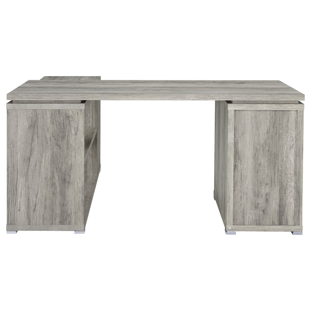 Bring organization and productivity into your workspace with this versatile L-shape office desk. Designed with an articulating return, it offers generous surface space for computers, books, and projects while keeping everything within reach. Two drawers and a built-in file cabinet provide secure storage for documents and supplies, while open shelving adds flexible display options. Crafted with engineered wood and laminate veneer, this sturdy desk blends durability with functional style for the modern office. Key Features: • L-shape office desk with articulating return in white finish • Two drawers and one file cabinet for efficient office storage • File cabinet holds both legal size and letter size documents • Open shelving offers easy access and versatile display options • Reversible configuration adapts to any office layout with ease • Engineered wood with laminate veneer ensures lasting durability